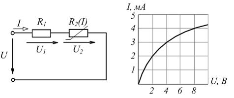 Для нелинейной цепи задана зависимость тока от входного напряжения (см. рис.). Если