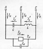 Компенсация тока обратной последовательности осуществляется с помощью конденсаторной батареи С и дросселя L.