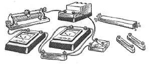 Оборудование: амперметр лабораторный, вольтметр лабораторный, источник питания, набор из трёх резисторов сопротивлениями 1 Ом, 2 Ом, 4 Ом, реостат, ключ замыкания тока, соединительные провода.