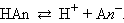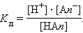 По величине степени диссоциации электролиты делятся на слабые и сильные. Для сильных электролитов, к которым относятся некоторые минеральные кислоты и щелочи, большинство солей, α > 30 %. Для слабых электролитов устанавливается равновесие между недиссоциированными молекулами и ионами. К слабым электролитам относятся плохо растворимые соли (см. таблицу растворимости), вода, большинство органических кислот (например, уксусная CH3COOH, муравьиная HCOOH), а также неорганические соединения (H2CO3Угольная кислота., H2SСероводородная кислота., HCNЦиановодородная (синильная) кислота., H2SiO3Метакремниевая кислота., H2SO3Сернистая кислота., HNO2Азотистая кислота., HClOХлорноватистая кислота., HCNOЦиановая кислота., NH4OHГидроксид аммония., большинство оснований). Важнейшей характеристикой слабого электролита служит константа диссоциации. Рассмотрим равновесную реакцию диссоциации слабого электролита HAn: