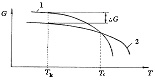 Рис.2.2. Изменение свободной энергии в зависимости от температуры для металлов идком (1) и твердом (2) состояниях
