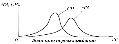 При теоретической температуре кристаллизации (DТ=0) значения ЧЗ и СР равны нулю и процесс кристаллизации не происходит, что находиться в полном соответствии с изложенным выше положением о необходимости переохлаждения для протекания процесса кристаллизации. С увеличением переохлаждения ЧЗ и СР возрастают, достигают максимума и затем снижаются практически до нуля при больших величинах переохлаждения.
