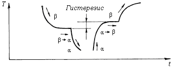 Рис.2.6. Кривые охлаждения и нагрева металла, имеющего полиморфные превращения