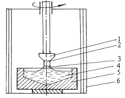 Рис.2.9. Схема установки для выращивания монокристаллов по методу Чохральского: 1 – шток; 2 – затравка; 3 – растущий монокристалл; 4 – расплав; 5 – графитовый тигель с нагревателем; 6 – рабочая камера