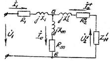 На рис.3а приведена Т-образная схема замещения. Схема замещения трансформатора – это сочетание двух схем замещения, для первичной и вторичной обмоток, которые соединены между собой в точках а и в. В цепи первичной обмотки включены сопротивления