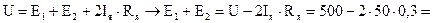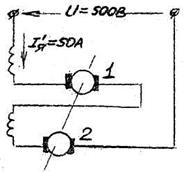 Для тяговых двигателя последовательного возбуждения одинаковой конструкции нагружаются поочерёдно. Напряжение сети U = 500 В. В начале к сети подключается один из этих двигателей и нагружается до тех пор, пока его частота вращения не достигнет n1 = 700 об/мин. Потребляемый из сети ток этого двигателя равен Iя1 = 50 А. Затем то же самое проделывают со вторым двигателем. При той же частоте вращения потребляемый из сети ток Iя2 = 55 А. Внутренне сопротивление цепи якоря каждого двигателя Rя = 0,3 Ом. Валы двух двигателей соединены муфтой. Их электрические цепи соединены последовательно и подключены к сети U = 500 В. Затем оба двигателя нагружаются до тех пор, пока потребляемый ток достигнет значения