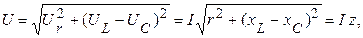 В приведенном примере напряжение опережает ток на j, т.к. xL > xC и режим работы цепи активно-индуктивный.