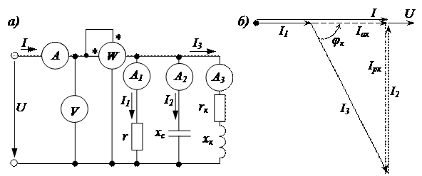 а) – электрическая схема, б) – векторная диаграмма
