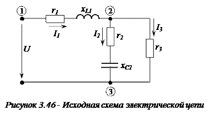 Пример 3.9. На рисунке 3.46, приведена электрическая цепь с одним источником питания, параметры которой соответственно равны: U = 100 (B), r1 = 9 (Ом), xL1 = 12 (Ом), r2 = 6 (Ом), xC2 = 8 (Ом), r3 = 10 (Ом). Требуется определить токи во всех ветвях электрической цепи символическим методом.
