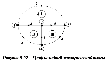 2.2. Вычерчиваем граф схемы, в котором выделяем ветви дерева и ветви связи. Для данной схемы граф имеет вид, представленный на рисунке 3.52.
