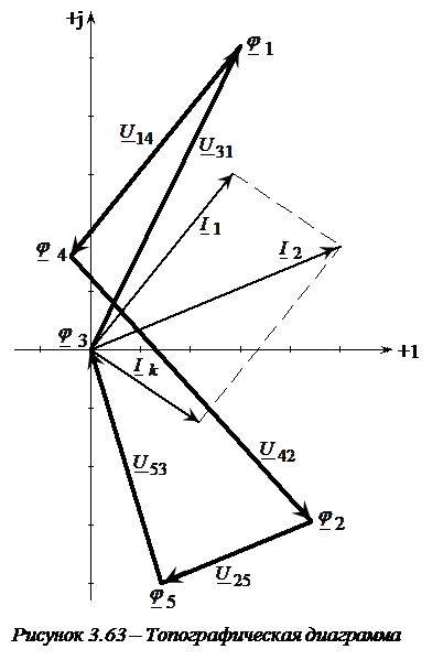 7. Строим топографическую диаграмму (рис. 3.61). На рисунке 3.61 приведены также комплексы токов