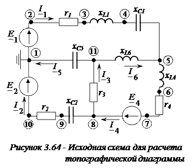 Пример 3.13. Построим топографическую диаграмму электрической цепи, приведенную на рисунке 3.62. Из примера 3.10, следует, что комплекс ЭДС источника напряжения