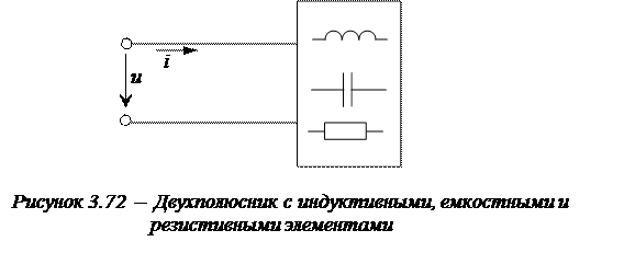 Допустим, имеется двухполюсник (рис. 3.72), содержащий индуктивные, емкостные и резистивные элементы, к зажимах которого приложено синусоидальный