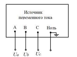 Первоначально практически любой источник электрической энергии переменного тока является трехфазным. Такие источники имеют три рабочих контакта и один «нулевой» (рис. В.1). Нулевой провод по возможности заземляется. Напряжение на рабочих контактах смещено по фазе на 120 град.:
