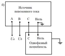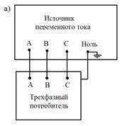 Потребители электрической энергии бывают как трехфазные, так и однофазные. При трехфазном потреблении электрическая машина подсоединяется к фазным контактам A, B, C, а нулевой провод обычно соединяется с корпусом прибора для обеспечения безопасности персонала от поражения электрическим током (рис. В.2, а). При однофазном потреблении электрическая машина подсоединяется к одному из фазных контактов и нулевому проводу, а корпус прибора заземляется через отдельный провод (рис. 8.2, б).