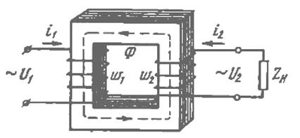 Простейший однофазный двухобмоточный трансформатор состоит из трех основных частей: магнитопровода и двух обмоток. Одна из обмоток трансформатора - первичная – подключается к источнику переменного тока напряжением U 1 (рис. 1.1). Вторая обмотка – вторичная – обычно замыкается на нагрузку с полным сопротивлением Z н, но она может оставаться и разомкнутой.
