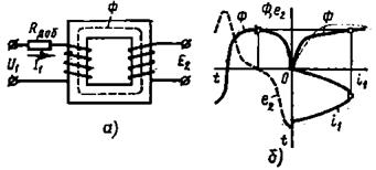 (рис. 1.33, а). Магнитную индукцию выбирают такой, чтобы магнитопровод находился в состоянии сильного магнитного насыщения. Однако намагничивающий ток и при этом будет иметь синусоидальную форму, так как его величина определяется сопротивлением