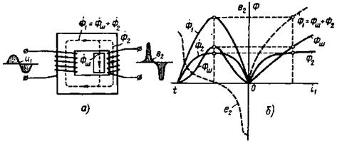 . Магнитный поток Ф в магнитопроводе изменяется по уплощенной кривой (рис. 1.33, б), а вторичная э. д. с.