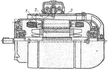 Пазы статора могут быть полузакрытыми или полуоткрытыми. В машинах переменного тока малой и средней мощности применяют полузакрытые пазы (рис. 3.4). Каждый паз изолируют 1, а затем заполняют проводниками обмотки 2. Обмотку статора закрепляют в пазах с помощью деревянных или пластиковых клиньев 3. В трехфазныз двигателях обмотка трехфазная; фазы сдвинуты в пространстве относительно друг друга на 120 эл. град.