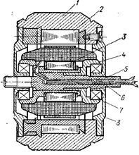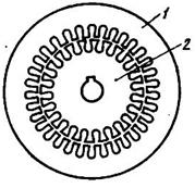 Для уменьшения потерь на вихревые токи сердечник статора набирают из штампованных листов электротехнической стали толщиной 0,35÷0,5 мм. Листы штампуются в виде колец 1 (рис. 3.3). На внутренней стороне колец 2 имеются углубления – пазы, в которые укладываются провода обмотки статора. Листы перед сборкой изолируют, покрывая слоем лака.