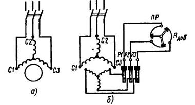В асинхронных машинах большой мощности и в некоторых специальных машинах малой мощности для получения большого пускового момента и широкого диапазона регулирования частоты вращения применяются фазные роторы. В пазах такого ротора укладывают не стержни, а изолированные проводники катушек (секций) трехфазной обмотки, выполненной аналогично обмотки статора и соединенной в звезду. Концы фаз обмотки ротора присоединяют к изолированным друг от друга и вала двигателя контактным кольцам, по которым при вращении ротора скользят укрепленные в щеткодержателях щетки. С помощью контактных колец и щеток обмотка ротора соединяется с пусковыми (ПР) или регулировочными реостатами (рис. 3.6).
