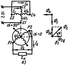 Сцепляясь со вторичной обмоткой, этот поток индуктирует в ней э. д. с. E2, величина которой зависит от положения вторичной обмотки относительно обмотки возбуждения, т. е. от угла поворота ротора