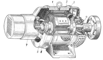 Концы этой обмотки подводят к контактным кольцам 5. Для подачи постоянного тока в обмотку возбуждения по контактным кольцам скользят щетки 6. Источником постоянного тока в рассматриваемой машине служит возбудитель 7, представляющий собой генератор постоянного тока, якорь которого укреплен на общем валу с ротором синхронной машины.