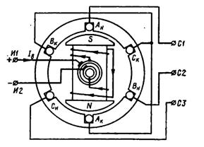 Магнитное поле ротора, созданное постоянным током, подведенным на зажимы И1 – И2 обмотки возбуждения, вращаясь вместе с ротором, пересекает проводники обмотки статора и наводит в ее фазах э. д. с.