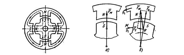 Если внешняя система полюсов неподвижна, то благодаря силам взаимного притяжения внутренняя система расположится так, что ее полюсы будут находиться под полюсами внешней системы противоположной полярности. При этом силы, действующие на полюсы внутренней магнитной системы