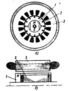В настоящее время получили распространение две конструкции роторов с постоянными магнитами: в первой из них (рис. 4.14, а) постоянный магнит 1 и шихтованный сердечник 2 с короткозамкнутой обмоткой располагаются в расточке статора 3 радиально; во второй (рис. 4.14, б) – аксиально. Роторы последней конструкции обычно применяют для многополюсных машин с малым внутренним диаметром статора в тех случаях, когда выполнение лучшей в электромагнитном отношении первой конструкции затруднительно.