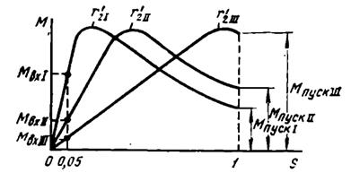 На рис. 4.18 показан ряд зависимостей электромагнитного момента от скольжения при разных значениях активного сопротивления пусковой клетки, причем