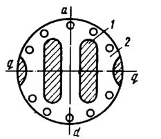 В последнее время появились синхронные реактивные двигатели, у которых значительная разность магнитных сопротивлений по поперечной и продольной осям создается не за счет глубины межполюсных впадин, а за счет внутренних вырезов 1 в шихтованном сердечнике 2 ротора (рис. 4.19). Эти вырезы обычно заливаются алюминием. Такие двигатели обладают повышенными пусковыми и рабочими свойствами.