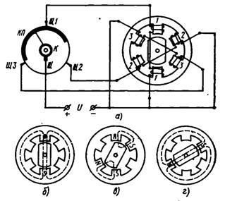 На рис. 4.28, а (справа) изображена схема одного из таких двигателей, имеющего три пары явно выраженных полюсов на статоре, снабженных согласно включенными обмотками (соответственно 1, 2, 3), и невозбужденный двухполюсный ротор. На том же рисунке (слева) изображен ключ – коллектор (коммутатор), с помощью которого осуществляется управление двигателем. Коммутатор выполнен в форме цилиндра с контактной пластиной КП, охватывающей дугу в 180°. Контактная пластина электрически соединена с контактным кольцом К, по которому скользит щетка Щ; на нее подается питание от сети постоянного тока (+). По внешней поверхности цилиндра коммутатора скользят щетки Щ1, Щ2, ЩЗ, сдвинутые в пространстве на 120° относительно друг друга. Каждая из щеток соединена с одним концом соответствующей обмотки двигателя. Другие концы обмоток соединены между собой, к их общему проводу подводится питание от источника постоянного тока (-).