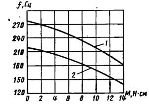 В связи с многообразием рабочих режимов рабочие характеристики шаговых двигателей весьма разнообразны. В качестве примера рассмотрим предельные динамические характеристики пуска двигателя типа ШД-2-5, представляющие собой зависимость частоты приемистости f от момента сопротивления нагрузки МC. Из представленных на рис. 4.30 двух динамических характеристик видно, что с увеличением момента сопротивления частота приемистости снижается. При этом характеристика 1 двигателя, соответствующая моменту инерции нагрузки