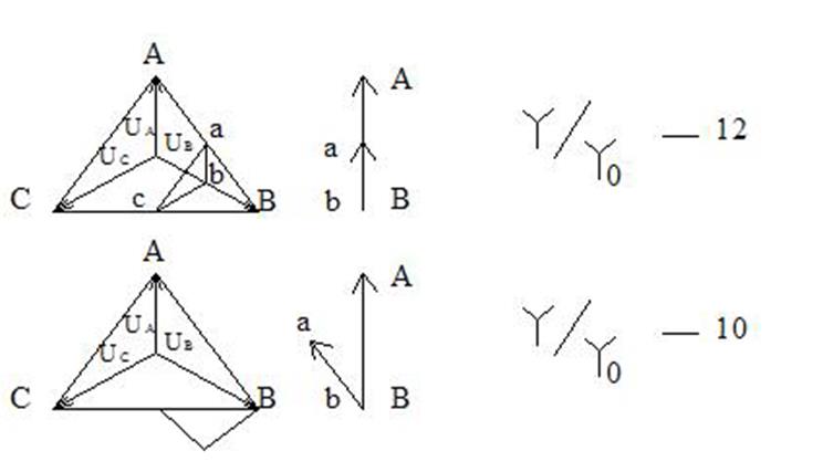 Она определяется из векторной диаграммы по стрелочным часам, при этом вектор ЭДС обмотки ВН соответствует минутной стрелке, установленной на цифре 12, а вектор ЭДС обмотки НН – часовой стрелке.