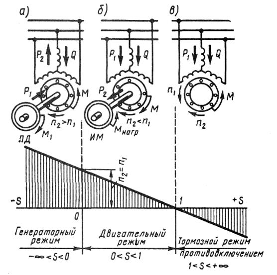 Режимы работы Генераторный режим. Если обмотку статора включить в сеть, а ротор асинхронной машины посредством приводного двигателя ПД (двигатель внутреннего сгорания, турбина и т.п.), являющегося источником механической энергии, вращать в направлении вращения магнитного поля статора с частотой n 2 > n1, то направление движения ротора относительно поля статора изменится на обратное (по сравнению с двигательным режимом работы этой машины), так как ротор будет обгонять поле статора. При этом скольжение станет отрицательным, а ЭДС, наведенная в обмотке ротора, изменит свое направление. Электромагнитный момент на роторе М также изменит свое направление, т.е. будет направлен встречно вращающемуся магнитному полю статора и станет тормозящим по отношению к вращающемуся моменту приводного двигателя M1(рис. 4, а). В этом случае механическая мощность приводного двигателя в основной своей части будет преобразована в электрическую активную мощность Р2 переменного тока. Особенность работы асинхронного генератора состоит в том, что вращающееся магнитное поле в нем создается реактивной мощностью Q трехфазной сети, в которую включен генератор и куда он отдает вырабатываемую активную мощность Р2. Для работы асинхронного генератора необходим источник переменного тока, при подключении к которому происходит возбуждение генератора, т. е. в нем возбуждается вращающееся магнитное поле.
