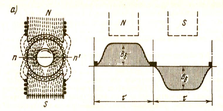 При работе машины в режиме х.х. ток в обмотке якоря практически отсутствует, а поэтому в машине действует лишь МДС обмотки возбуждения.Магнитное поле машины в этом случае симметрично относительно оси полюсов (рис. 26.4, а). График распределения магнитной индукции в воздушном зазоре представляет собой кривую, близкую к трапеции.