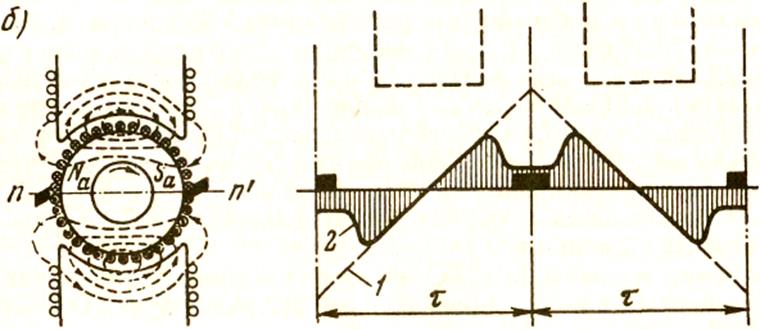 Наибольшее значение МДС якоря — на линии щеток (рис. 26.4, б, кривая 7), а по оси полюсов эта МДС равна нулю. Однако распределение магнитной индукции в зазоре от потока якоря совпадает с графиком МДС лишь в пределах полюсных наконечников. В межполюсном пространстве магнитная индукция резко ослабляется (рис. 26.4, б, кривая 2). Объясняется это увеличением магнитного сопротивления потоку якоря в межполюсном пространстве. МДС обмотки якоря на пару полюсов пропорциональна числу проводников в обмотке N и току якоря 1а: