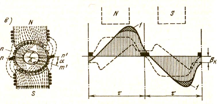 Искажение результирующего поля машины неблагоприятно отражается на ее рабочих свойствах. Во-первых, сдвиг физической нейтрали относительно геометрической приводит к более тяжелым условиям работы щеточного контакта и может послужить причиной усиления искрения на коллекторе Во-вторых, искажение результирующего поля машины влечет за собой перераспределение магнитной индукции в воздушном зазоре машины. На рис. 26.4, в показан график распределения результирующего поля в зазоре, полученный совмещением кривых, изображенных на рис. 26.4, а, б. Из этого графика следует, что магнитная индукция в зазоре машины распределяется несимметрично относительно оси полюсов, резко увеличиваясь под подмагниченными краями полюсов. Это приводит к тому, что мгновенные значения ЭДС секций обмотки якоря в моменты попадания их пазовых сторон в зоны максимальных значений магнитной индукции (под подмагниченные края полюсных наконечников) резко повышаются. В результате возрастает напряжение между смежными коллекторными пластинами Цк. При значительных нагрузках машины напряжение ик может превзойти допустимые пределы (см. § 25.5) и миканитовая прокладка между смежными пластинами будет перекрыта электрической дугой. Имеющиеся на коллекторе частицы графита будут способствовать развитию электрической дуги, что приведет к возникновению