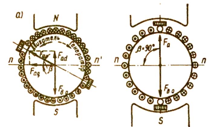 На рис. 26.4, в показано распределение магнитных силовых линий результирующего поля машины, работающей в генераторном режиме при вращении якоря по часовой стрелке. Такое же распределение магнитных линий соответствует работе машины в режиме двигателя, но при вращении якоря против часовой стрелки. Если принять, что магнитная система машины не насыщена, то реакция якоря будет лишь искажать результирующий магнитный поток, не изменяя его значения: край полюса и находящийся под ним зубцовый слой якоря, где МДС якоря совпадает по направлению с МДС возбуждения, подмагничиваются; другой край полюса и зубцовый слой якоря, где МДС направлена против МДС возбуждения, размагничиваются. При этом результирующий магнитный поток как бы поворачивается поток, не изменяя его значения: край полюса и находящийся под ним зубцовый слой якоря, где МДС якоря совпадает по направлению с МДС возбуждения, подмагничиваются; другой край полюса и зубцовый слой якоря, где МДС направлена против МДС возбуждения, размагничиваются. При этом результирующий магнитный поток как бы поворачивается относительно оси главных полюсов на некоторый угол, а физическая нейтраль тт' (линия, проходящая через точки на якоре, в которых индукция равна нулю) смещается относительно геометрической нейтрали пп' на угол а. Чем больше нагрузка машины, тем сильнее искажение результирующего поля, а следовательно, тем больше угол смещения физической нейтрали. При работе машины в режиме генератора физическая нейтраль смещается по направлению вращения якоря, а при работе двигателем — против вращения якоря.