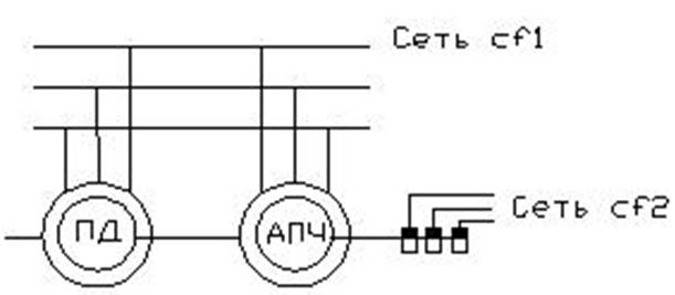 Мощность на выходе АПЧ складывается из электромагнитной мощности Р эм, передаваемой в обмотку ротора вращающимся полем статора, и механической мощности приводного двигателя Р пд, т.е. Р 2 = Р эм + Р пд. Соотношения между мощностями Р эм и Р пд зависит от скольжения. Так, при работе АПЧ со скольжением s = 2 эти мощности равны и ротор половину мощности получает от статора, а половину – от приводного двигателя. При необходимости плавной регулировки частоты на выходе АПЧ в качестве приводного двигателя применяют электродвигатель с плавной регулировкой частоты вращения, например двигатель постоянного тока. Однако чаще всего АПЧ используют для получения определенной частоты тока f 2 и в качестве приводного применяют асинхронный или синхронный двигатель.