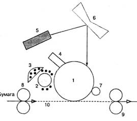 | Рис. 1. Функциональная схема лазерного принтера 1 — фотобарабан; 2 — барабан-девелопер; 3 — резервуар с тонером; 4 — провод разряда; 5 — лазер; 6 — отклоняющее зеркало; 7 — ролик очистки; 8 — механизм заряда; 9 — фиксирующие цилиндры; 10 — коронирующий провод |