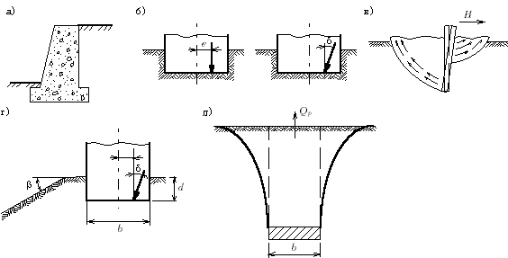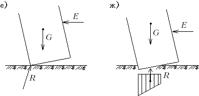 | Рис.Ф.4.3. Случаи, когда производится расчет по первому предельному состоянию: а - подпорная стена; б - эксцентричная нагрузка с горизонтальной составляющей; в - короткие сваи; г - сооружение вблизи откоса; д - анкерный фундамент, работающий на вырывание; е - схема для расчета на опрокидывание на жестком основании; ж - то же на мягком основании |