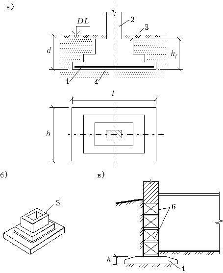 | Рис. Ф.9.2. Фундамент под колонну (а,б) и под стену (в): 1 - фундамент; 2 - колонна; 3 - обрез фундамента; 4 - подошва фундамента; 5 - подколонник; 6 - бетонные блоки |