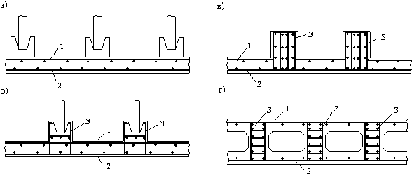 | Рис.Ф.9.22. Плитные фундаменты: а - со сборными стаканами; б - с монолитными стаканами;в - ребристая плита; г - плита коробчатого сечения: 1 - верхняя рабочая сетка; 2 - нижняя рабочая сетка;3 - вертикальная арматура |