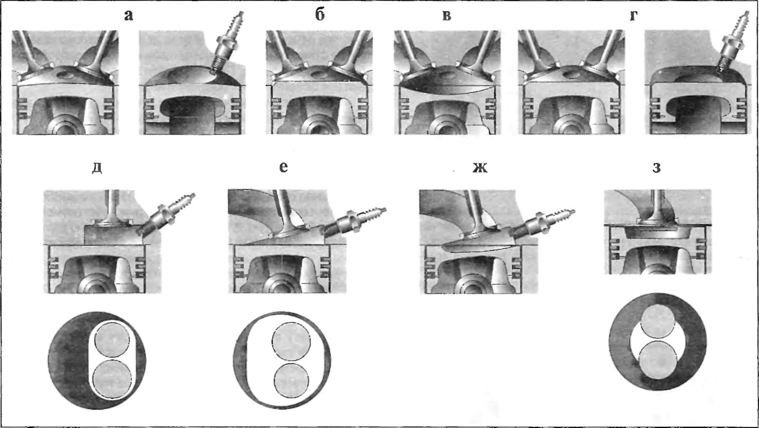 а — полусферическая; б — полусферическая с вытеснителем; в — сферическая; г — шатровая; д — плоскоовальная; е -клиновая; з — цилиндрическая камера сгорания в поршне; ж — полуклиновая с частью камеры в поршне;