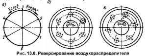 Система реверса служит для изменения направления вращения коленчатого вала мало- и среднеоборотных судовых дизелей. Независимо от принципа работы и способа исполнения устройство для реверсирования дизеля должно обеспечивать правильное чередование и изменение фаз распределения органов пуска, газораспределения, топливоподачи, а также реверсирование навешенных на дизель вспомогательных механизмов.Необходимость изменения фаз распределения при реверсировании дизеля вытекает из следующего. Предположим, что кривошипы коленчатого вала шестицилиндрового дизеля занимают положение, показанное на рис.13.6,а. В рассматриваемом варианте для пуска дизеля в направлении «Вперед» необходимо подать воздух в пятый цилиндр, который в рассматриваемом случае находится в пусковом положении и диск дискового воздухораспределителя (или пусковая шайба воздухораспределителя со звездообразным расположением золотников) соответственно должен находиться в положении, при котором воздух после открытия главного пускового клапана должен поступить к пусковому клапану пятого цилиндра (рис.13.6 б). При этом, пусковая шайба будет вращаться против часовой стрелки.Для пуска дизеля «Назад» из того же положения пусковой воздух необходимо подать в четвертый цилиндр. Для этого диск (или шайбу) необходимо повернуть в положение, показанное на рис.13. в; диск будет вращаться по часовой стрелке.