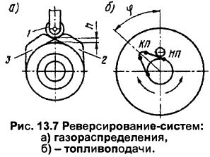Подача топлива в цилиндр обычно начинается до ВМТ и заканчивается после нее по прошествии 20-25° пкв. Следовательно, при положении поршня в ВМТ плунжер ТНВД еще продолжает свой нагнетательный ход, и кулачная шайба топливного насоса должна быть заклинена по отношению к кривошипу с отставанием на угол <р (рис.13.7, б). Точки НП и КП на профиле шайбы соответствуют началу и концу подачи топлива; их расположение зависит от способа регулирования ТНВД и цикловой подачи топлива. При реверсировании дизеля рабочий участок шайбы НП-КП находится на другой стороне ее профиля. Поэтому распределительный вал необходимо развернуть на угол 2<р (если шайбы имеют симметричный профиль) или сместить его в осевом направлении и подвести под ролики толкателей ТНВД другой комплект кулачных шайб.