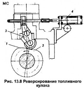 В двигателях МАН-МС топливный кулак имеет симметричный профиль и реверсирование фаз топливоподачи не требует разворота распределительного вала, а осуществляется перекидыванием ролика 3 с помощью сервомотора 4 с профиля кулака 1 на 2 или наоборот.