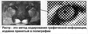 Если рассмотреть с помощью увеличительного стекла черно-белое графическое изображение, напечатанное в газете или книге, то можно увидеть, что оно состоит из мельчайших точек, образующих характерный узор, нарываемый растром, как показано на рисунке.